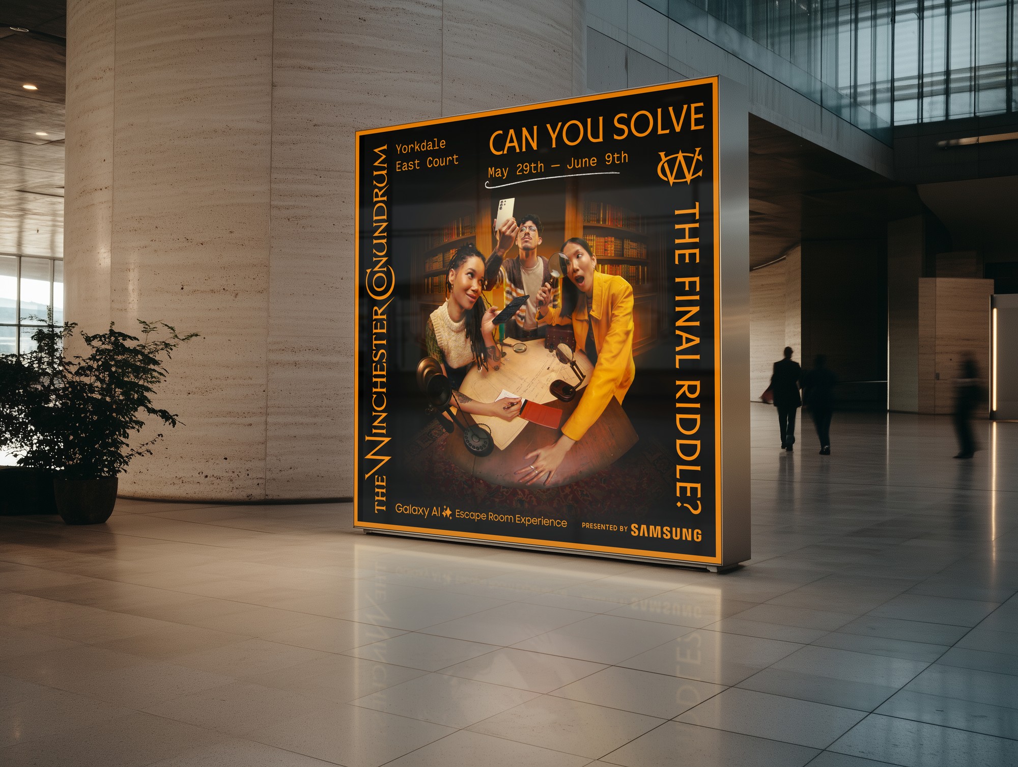 To promote Samsung’s new Galaxy S24 Ultra powered by Galaxy AI phone, Samsung wanted to create a uniquely immersive escape room experience at the Yorkdale Shopping Center in Canada. We created the identity and marketing system for the surprising and gasp inducing Winchester Conundrum.